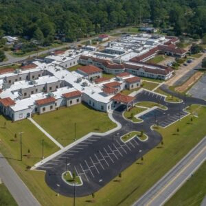 - The facility features nurses’ stations, administrative offices, common areas, housekeeping/laundry area, and a full commercial kitchen and cafeteria.