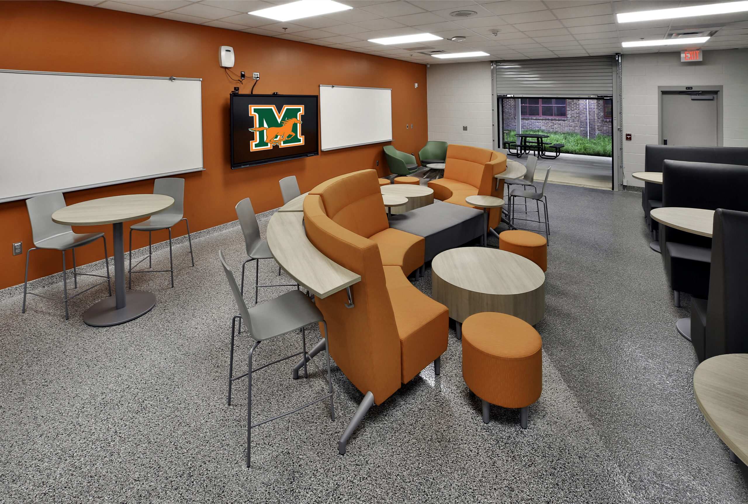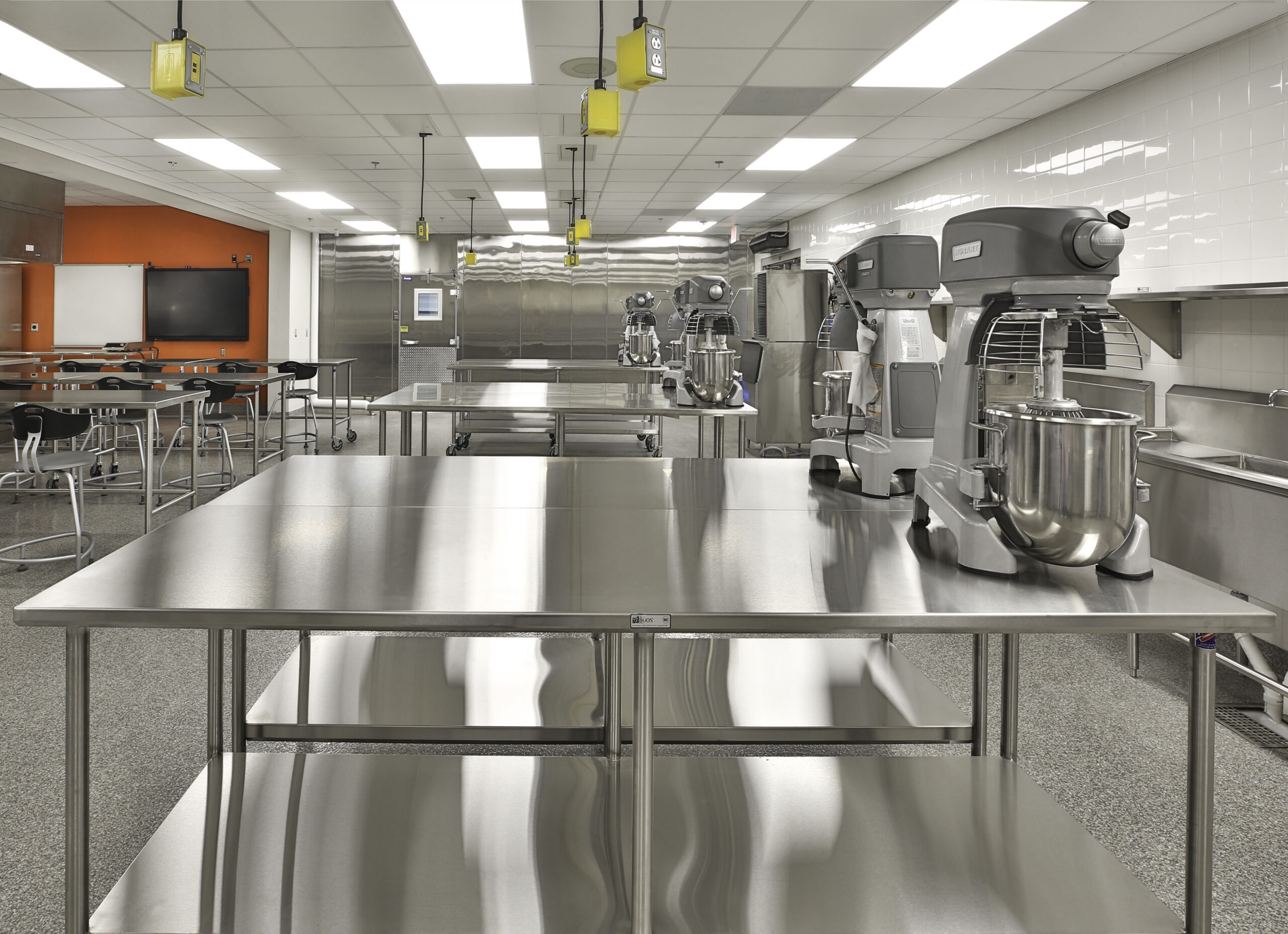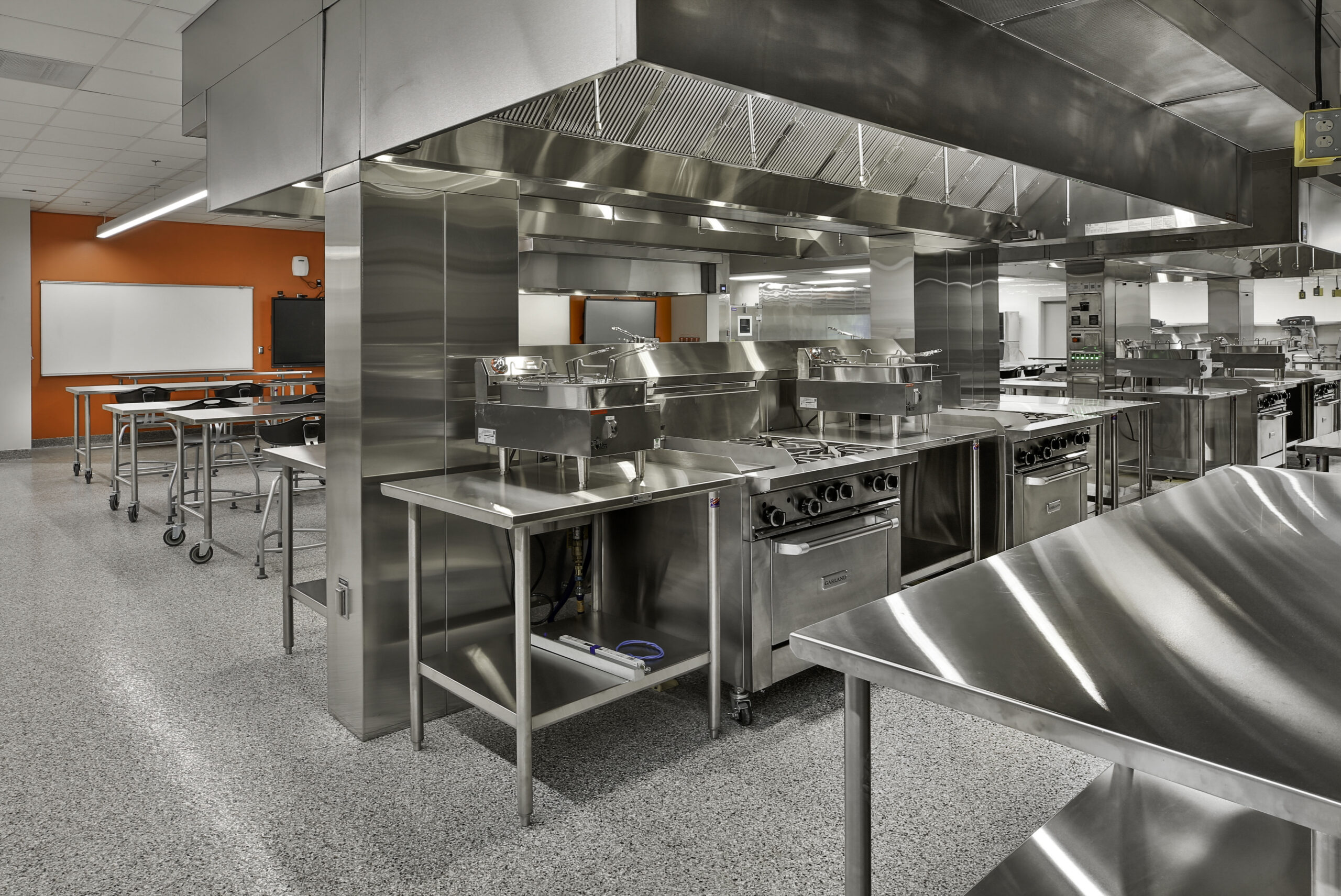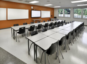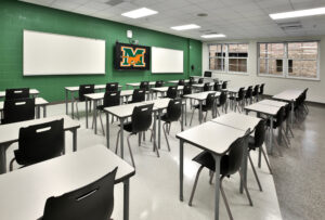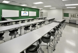 The project scope for the interior renovations in the existing building included converting the old culinary and medical spaces into general classrooms, a science lab, and a business lab, totaling 8,700 square feet.